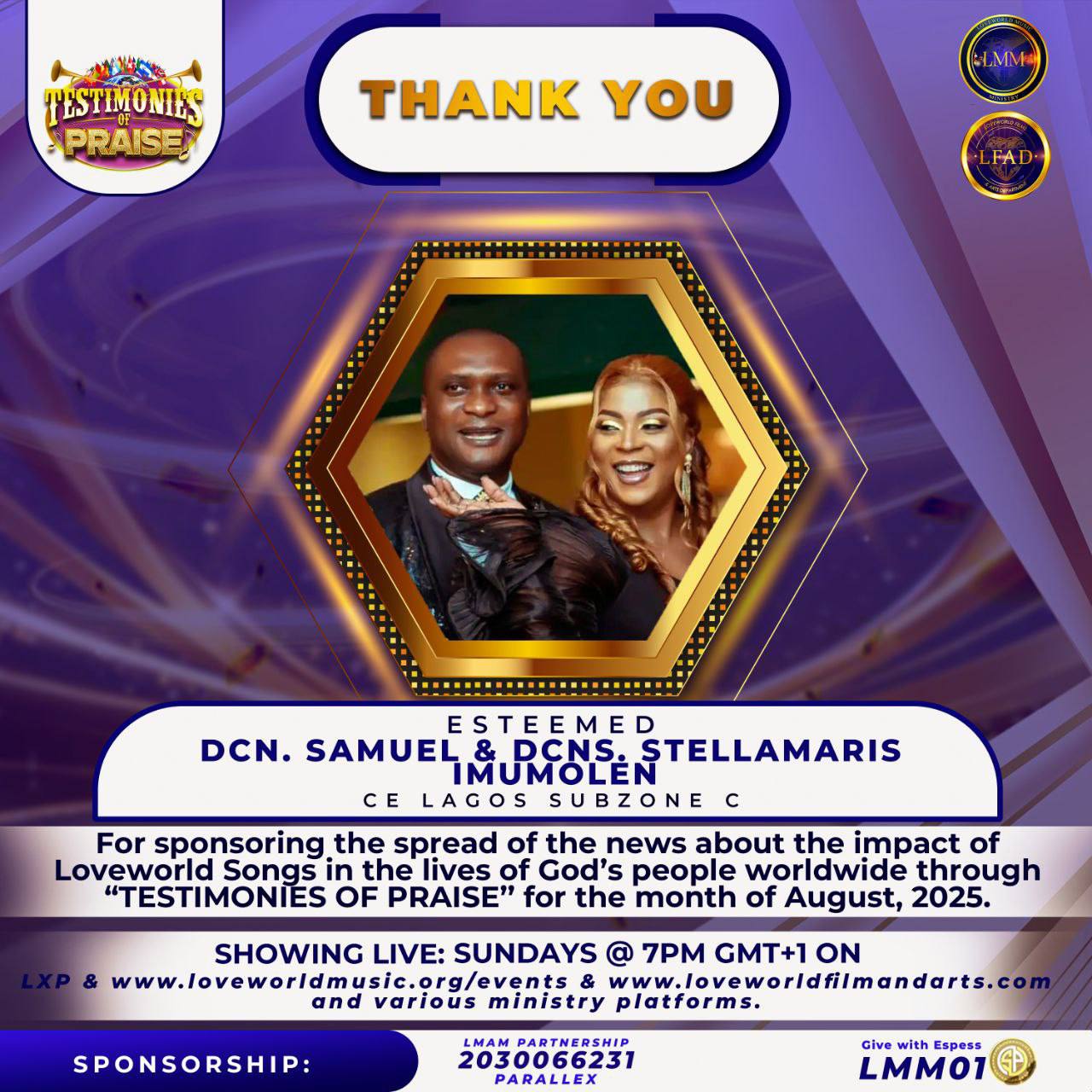 ππΌ Please join us in celebrating the Esteemed Dcn. Samuel and Dcns. StellaMaris Imumolen of Christ Embassy Lagos Sub-Zone C for spreading the news about the impact of Loveworld Songs in the lives of Godβs people around the world through their passionate sponsorship of βTESTIMONIES OF PRAISE.β